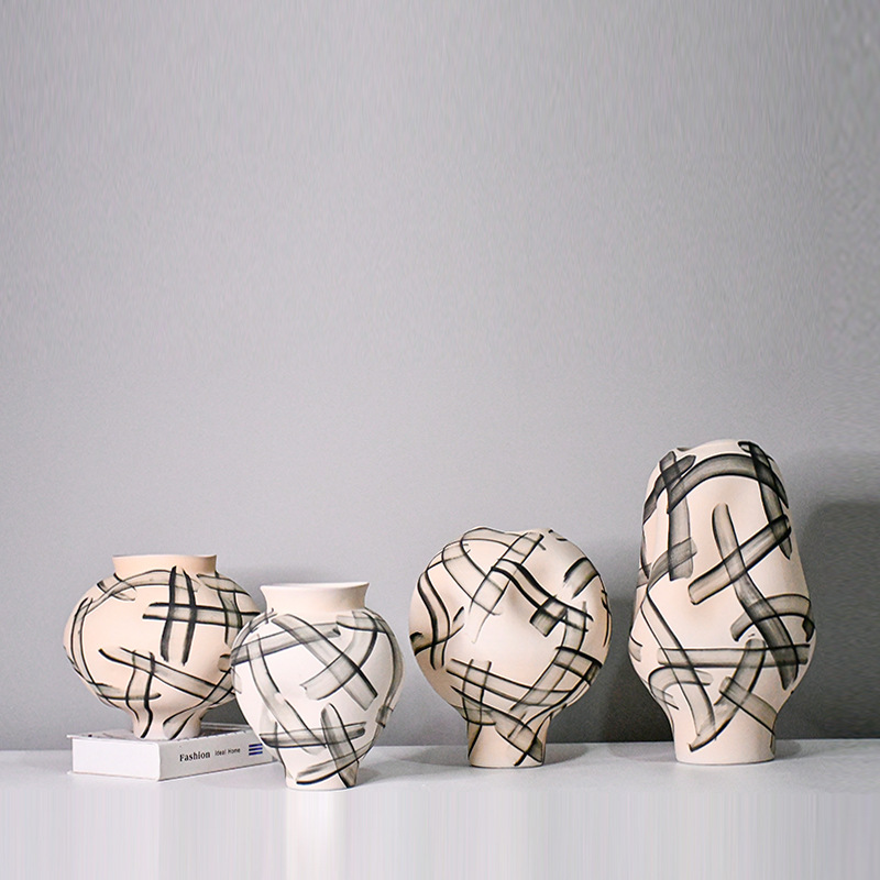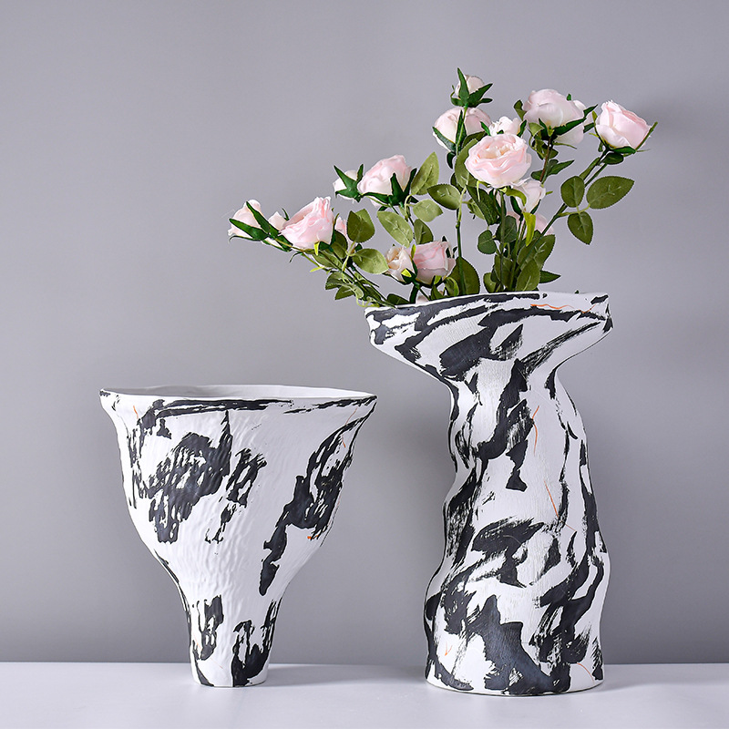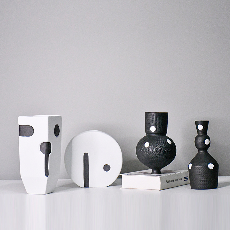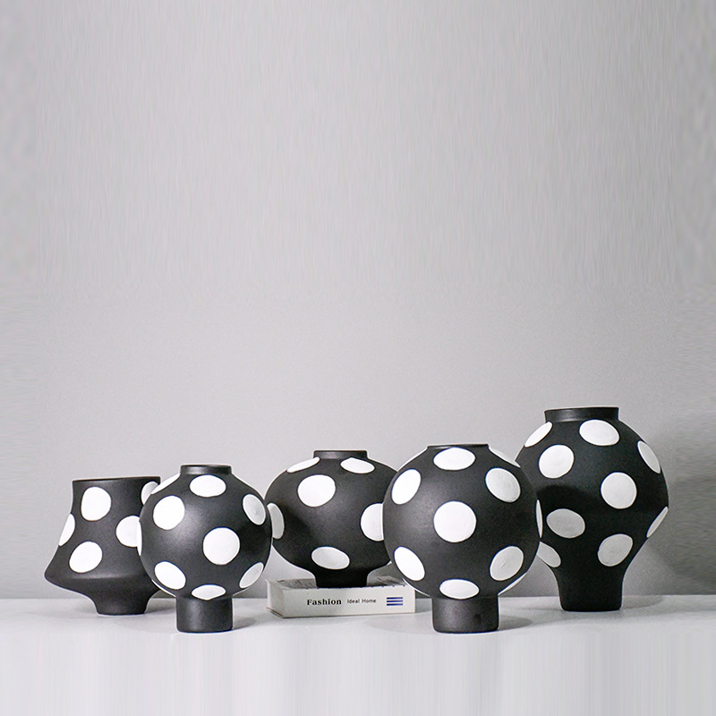 白黒の色合わせの波点の陶磁器の異形の花瓶の現代の家庭の装飾の本棚の酒の箱の置物は生け花の水を挿して栽培することができます。