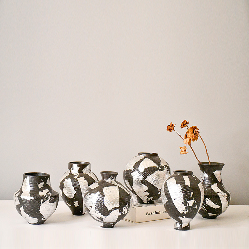 現代の驚きと寂しい黒銀跳刀の小さい陶磁器の花瓶の新しい中国式の見本の板の間の柔らかい装飾の家の小さい花の挿し込みの置物の卸売り