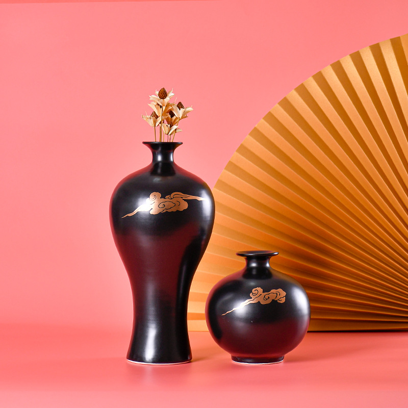 新しい中国式の黒い祥雲の小さい口の花瓶の置物のサンプルの部屋の客間の食卓は乾いた花器の装飾品を挿して飾っています。