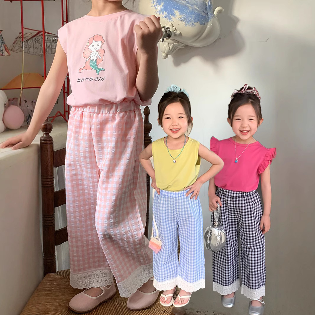 女の子の春の服の薄い格子の広い足のズボンの女性の赤ちゃんの春秋のドーパミンのズボンの9分のズボンの子供の服の防蚊のズボン