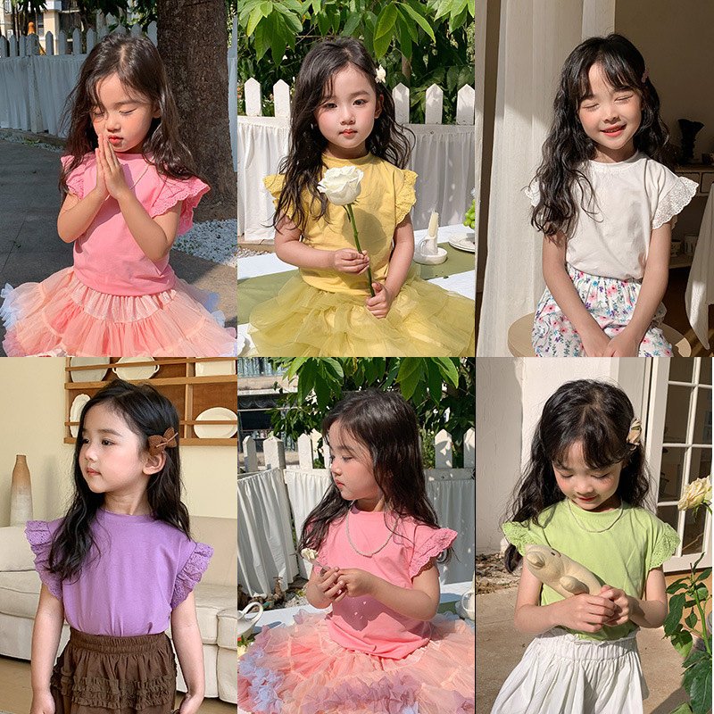 女の子半袖tシャツ2024夏服韓国版子供用丸首ボトムシャツレースのハスの葉の襟の上着の赤ちゃんの洋気t