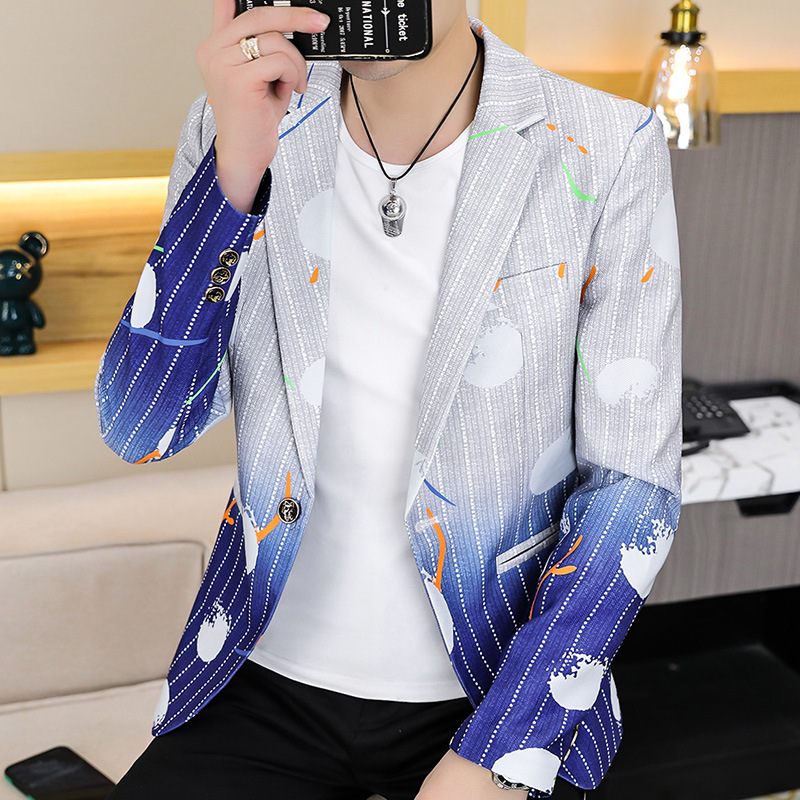 グラデーションスーツジャケット男2023春秋男性ストライプファッションプリント小スーツ修身韓国版青年紳士服