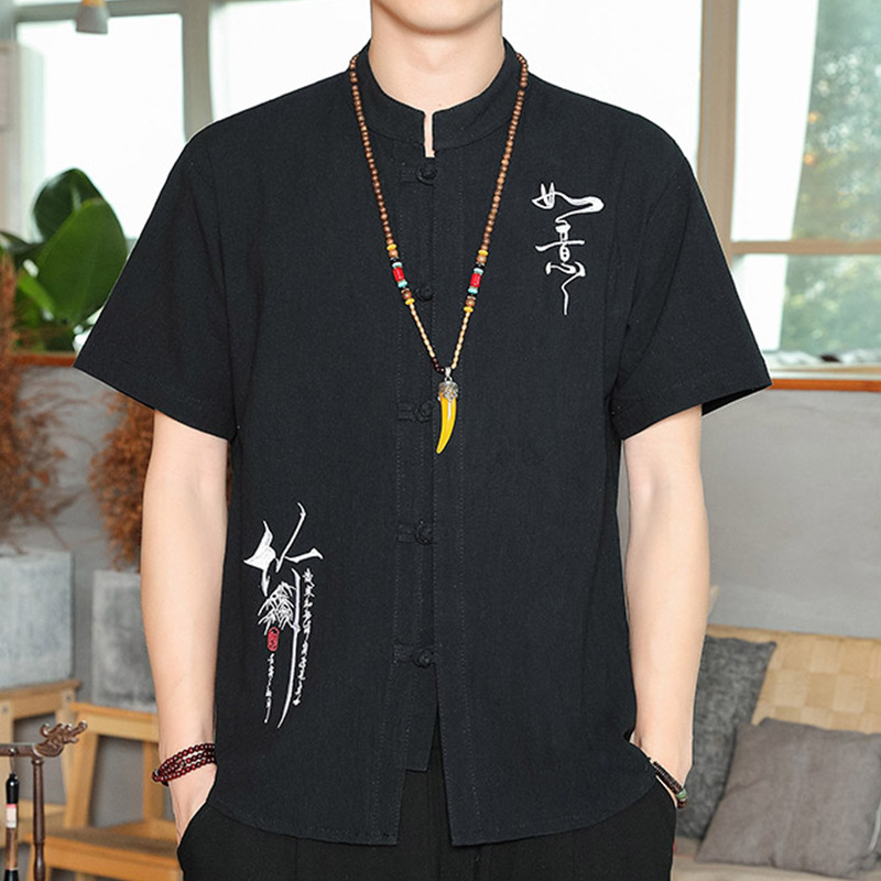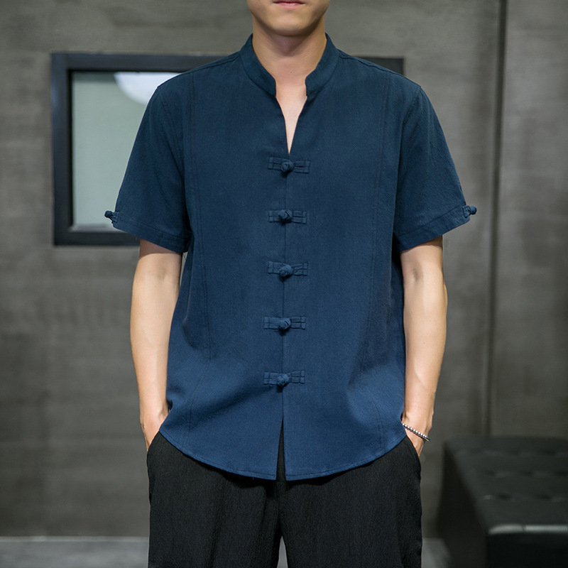 卸売り中国風紳士服復古風半袖tシャツ綿麻唐装漢服七分袖立襟tシャツ半袖男