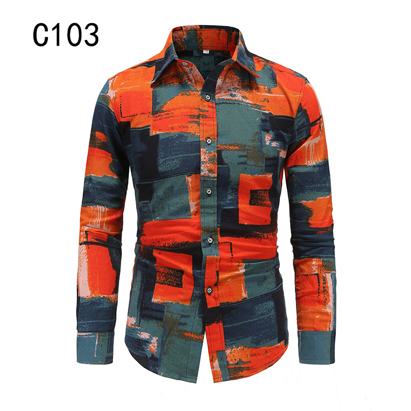 アマゾンの新型2023メンズ綿麻寸シャツの新型の大きいサイズの長袖シャツの花柄のプリントのシャツの男性はアイロンをかけません。