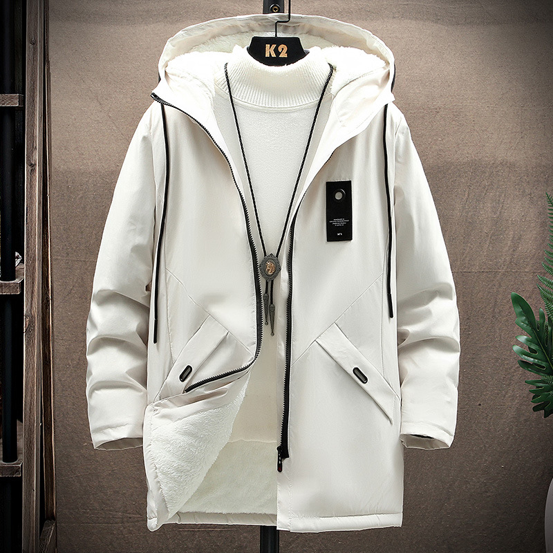2023新型の中長タイプの綿服の男性式のベルベットの風衣の韓国版の修身のファッションのカーディガンは帽子と一緒に厚いコートの男性を着ます。