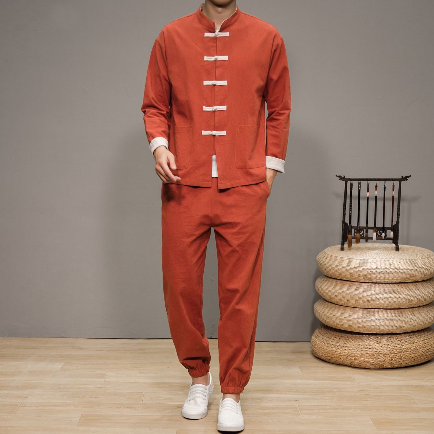 綿麻スーツ男2023春秋新作長袖シャツ唐装ルームウェアカジュアルリネン漢服中国風