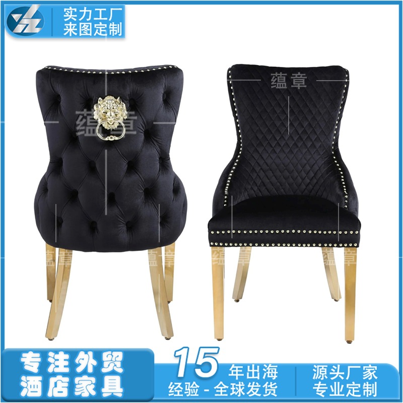 北欧ライト高級背もたれライオンヘッドプルバックルダイニングチェアステンレス鋼ラップチェアホテルレストランチェアブラックベルベット布椅子