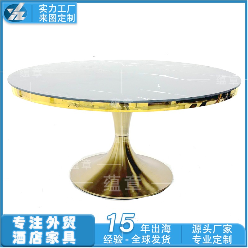 最新デザインのトランペットベースラウンドテーブルライト高級ロックプレートラウンドダイニングテーブルステンレス鋼のウェディングテーブルレストランテーブルと椅子