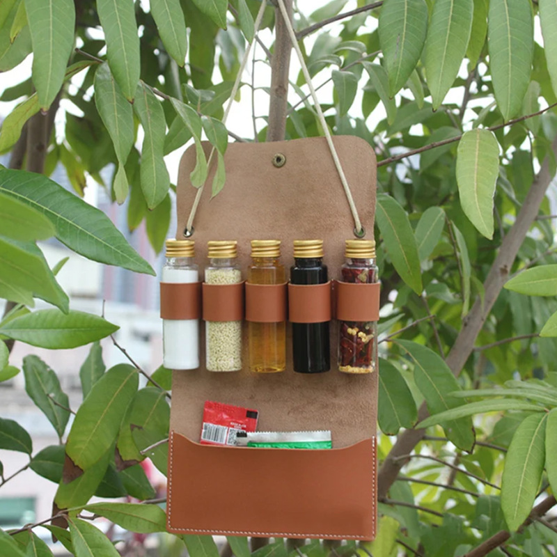 現物アウトドア野炊香料包みキャンプ焼き物調味料ガラス缶皮カバー吊り下げ式調味料瓶収納バッグ