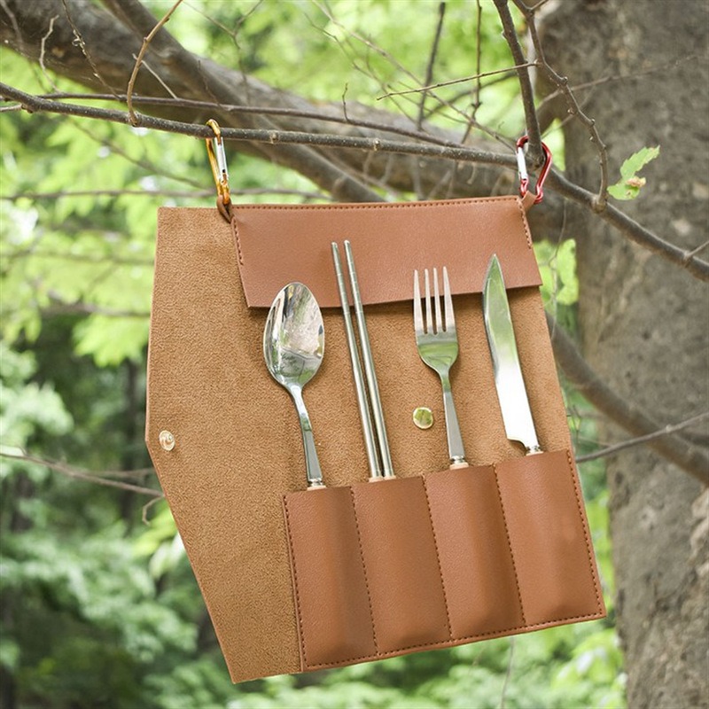 アウトドアキャンプナイフとフォーク防塵カバン折りたたみツール巻き包みレザー箸食器収納カバン