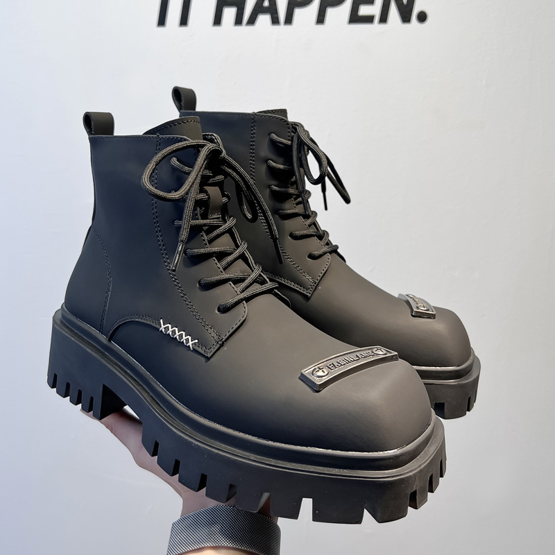 英倫の厚い底の中で黒いマーティンの靴の暗い黒い皮の靴の2023の新型の潮男の高い顔の値の街頭の潮流のブーツを手伝います。