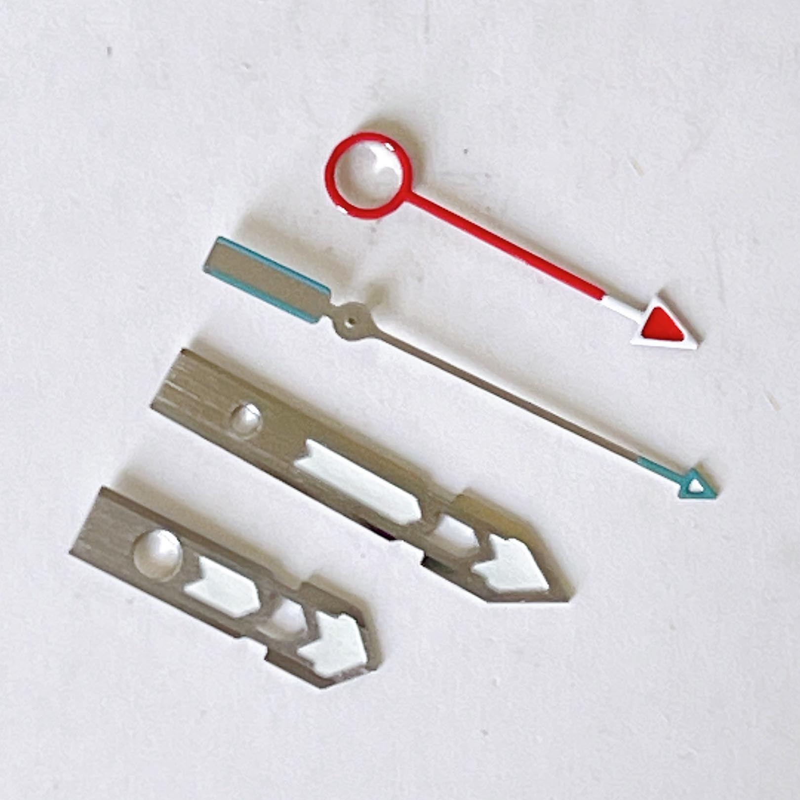 GMT腕時計の部品を改装したオレンジ色の青の色合わせの4針の針の緑の夜光の時計の針は日本のNH34のムーブメントに適しています。