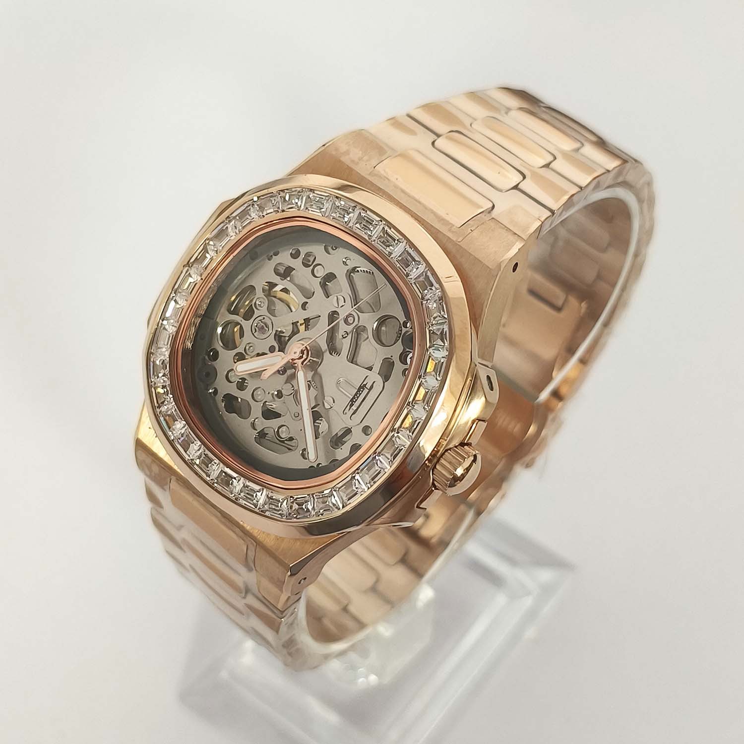 ロゴなしメンズ機械式時計 41MM ローズカラー レンガ中空モデル サファイアガラス グリーン夜光 NH70 ムーブメント付き