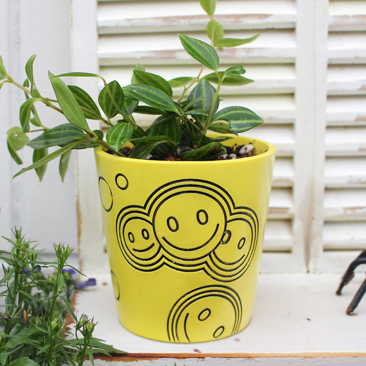 国境を越えた起爆樹脂が笑顔の植木鉢を飾っている屋外庭園の玄関の家のテーブルの上に机の筆立てを飾っている
