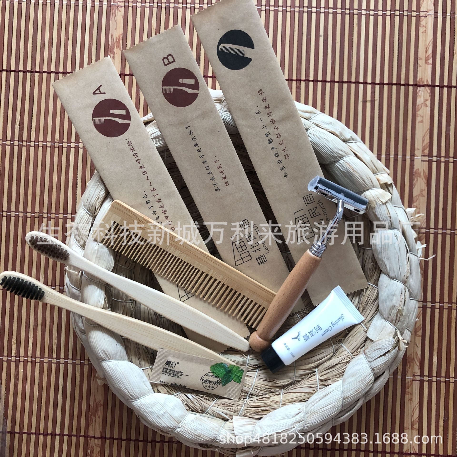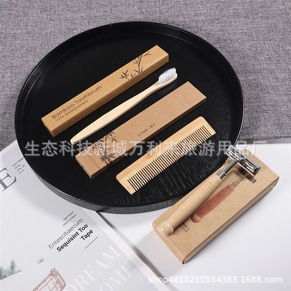 ホテル使い捨てソフト竹歯ブラシ木櫛木柄シェーバー洗面用品セットクラフト紙カードケース