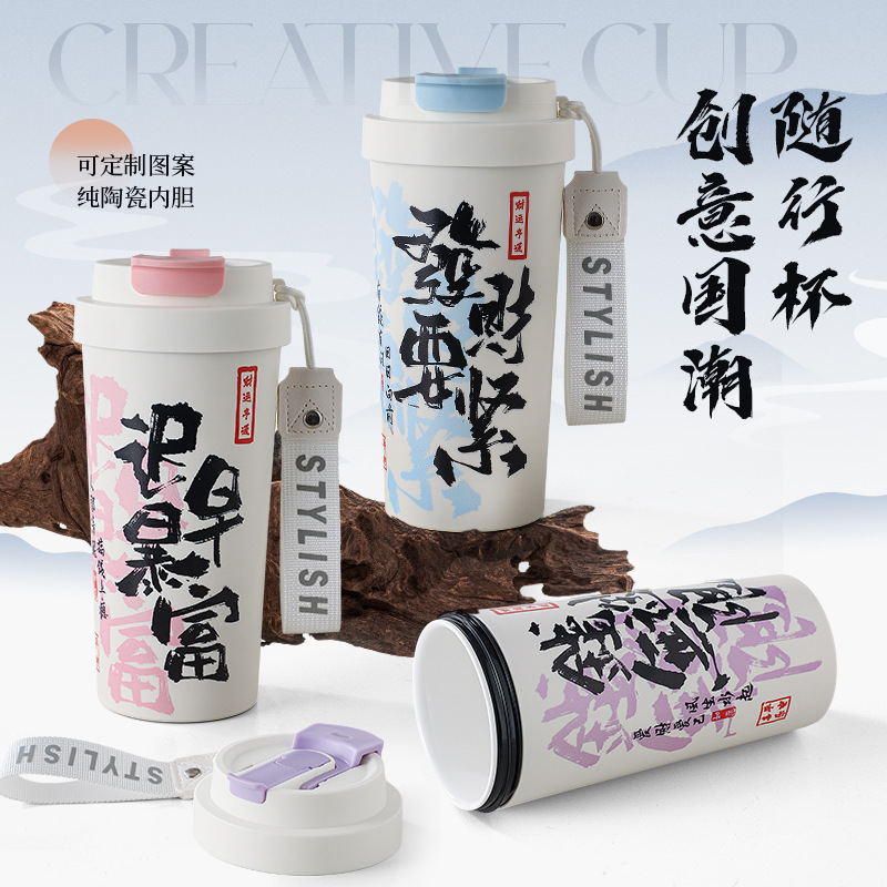セラミックライナー魔法瓶カップ、書道、高見えクリエイティブストロー、ダブルドリンクティー分離、男女兼用タンブラー、コーヒーカップ