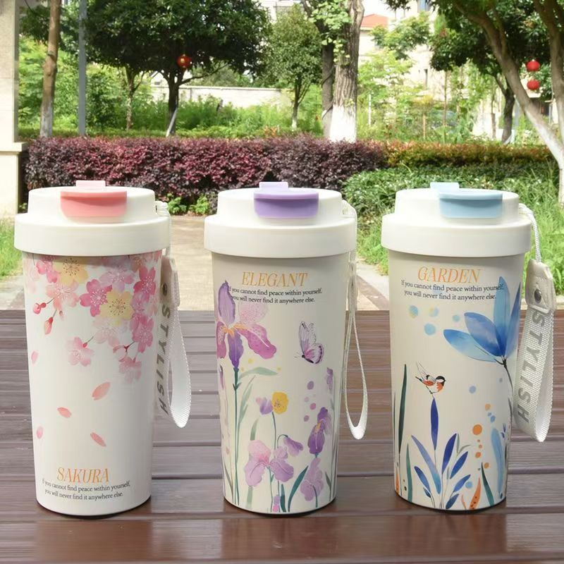 花の高価値セラミックライナー魔法瓶カップ大容量女性のダブルストローティーとコーヒーのカップ本物の磁器