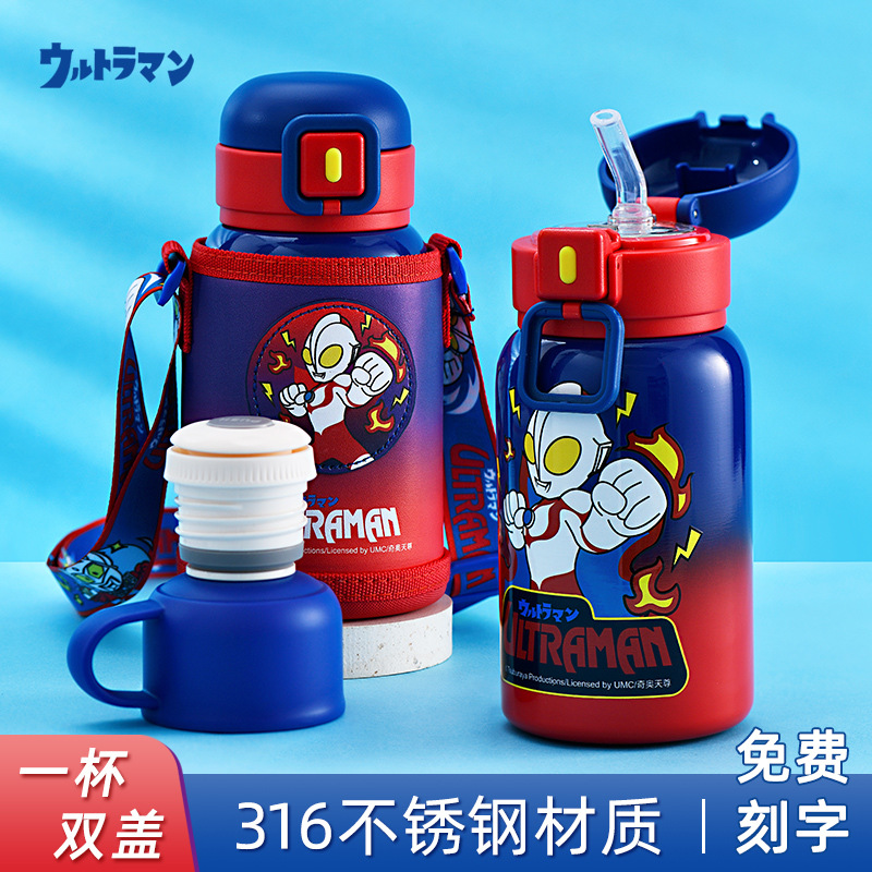 ウルトラマン保温カップダブル蓋学生水筒316ステンレスストロー直飲両用小学生通学専用