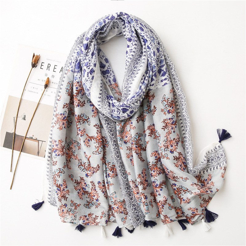 外国貿易の東南アジアのプリントの頭巾の復古的な民族風の無地の青と花の磁器の長いタイプのガーゼの綿の麻の手触りのマフラー