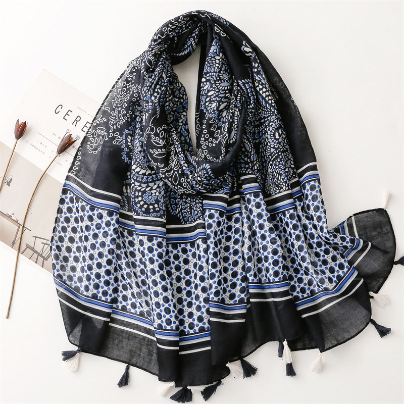 小清新ファッション名媛波点幾何学綿麻手触りマフラーバリ糸タオル青い保温ストール女性