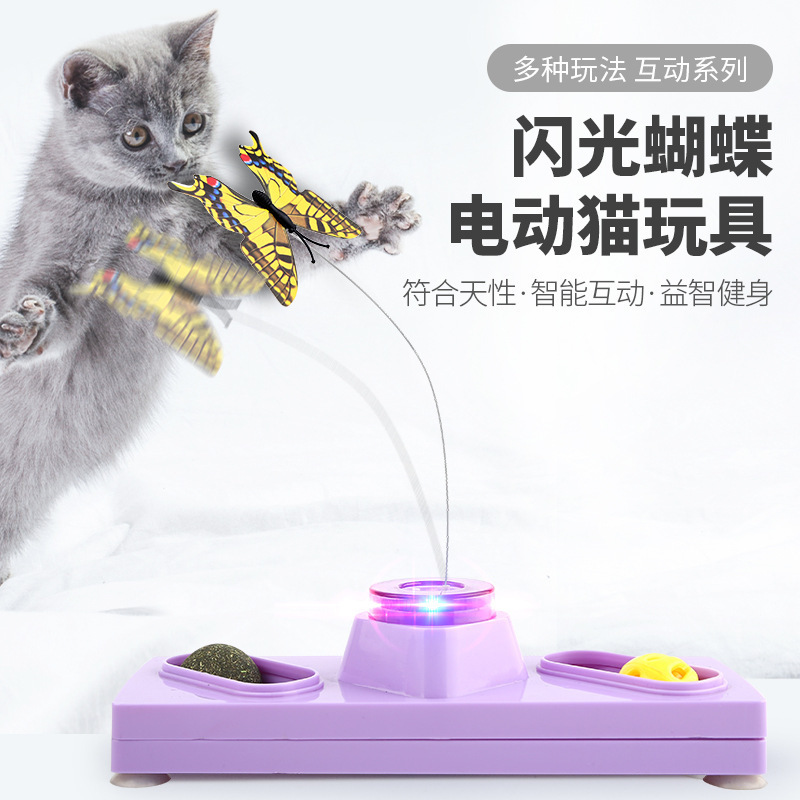 電動の猫のおもちゃは回転して猫の棒の蝶の小鳥の子猫を笑わせます。