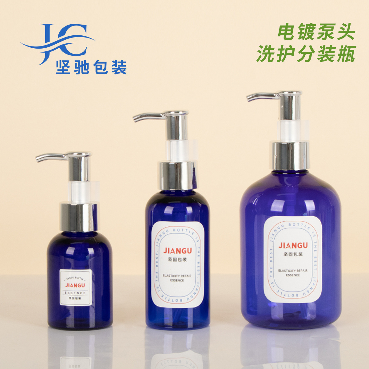 ブルーシャンプーボトル 100 ミリリットルプレスポンプボトルラベルハンドサニタイザーシャワージェルペットプラスチックボトル卸売