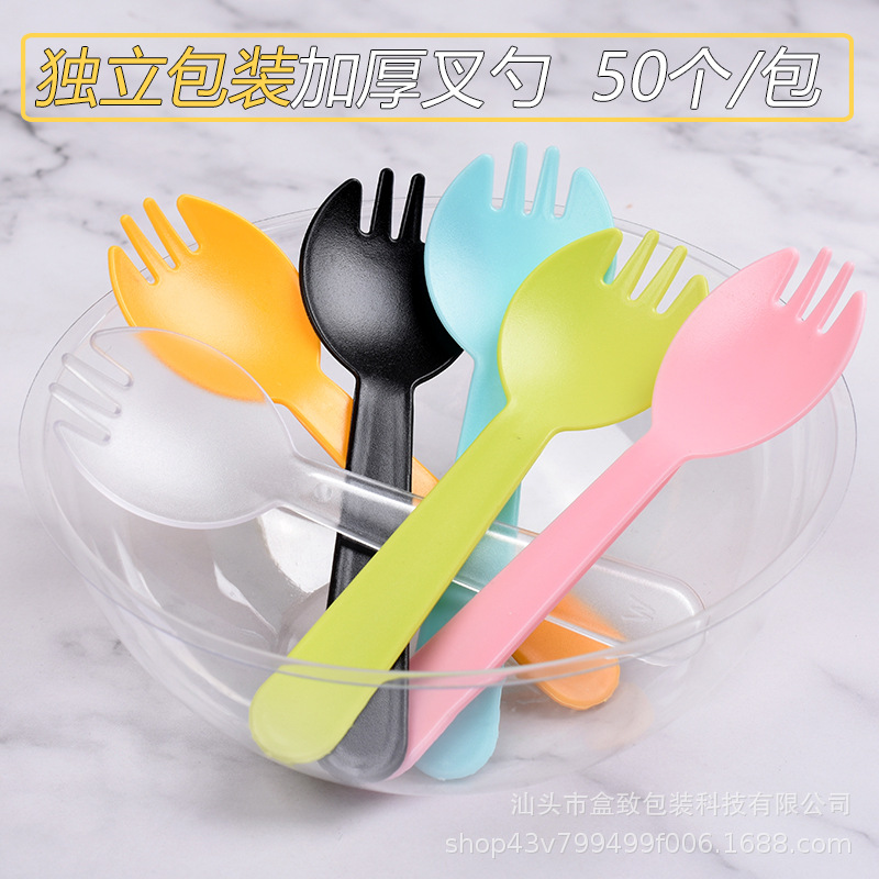 ケーキの厚い色の3歯のフォークのスプーンの使い捨てのつや消しのプラスチックの独立して甘いもののスプーンを包装して卸売りして直接販売します。