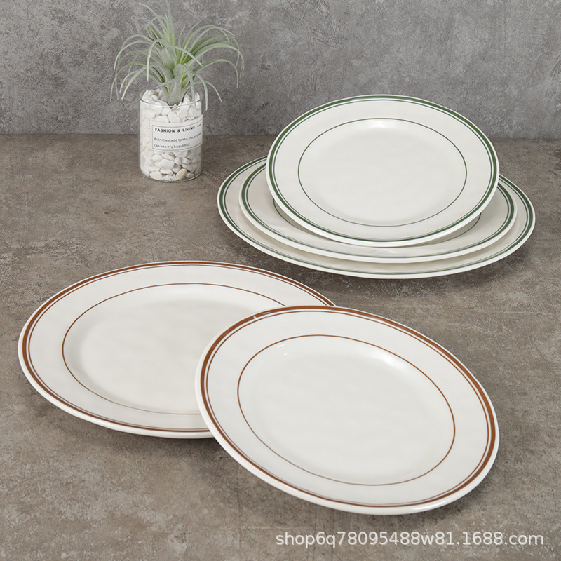 メラミン黒灰日本式ステーキ皿模造磁器創意レストラン円形洋食平皿商用復古料理皿浅皿