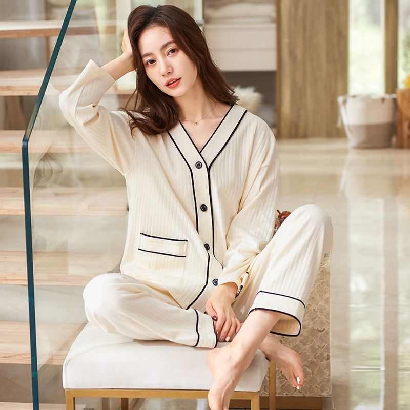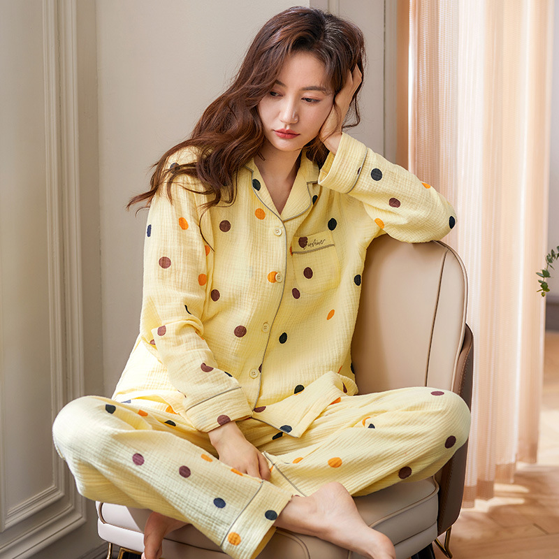 軒の美しいメーカーの直売の家の服の春と秋の女性の襟のvネックのカーディガンの純綿は外でしわの布のパジャマを着ることができます。