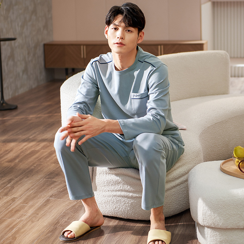 軒の美しいメーカーの直売春と秋の家庭服の両面の純綿の頭の丸首の長袖のズボンの2セットのパジャマの男