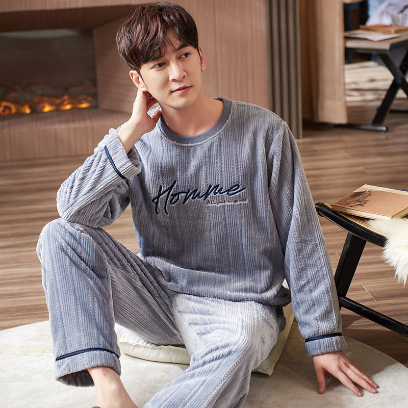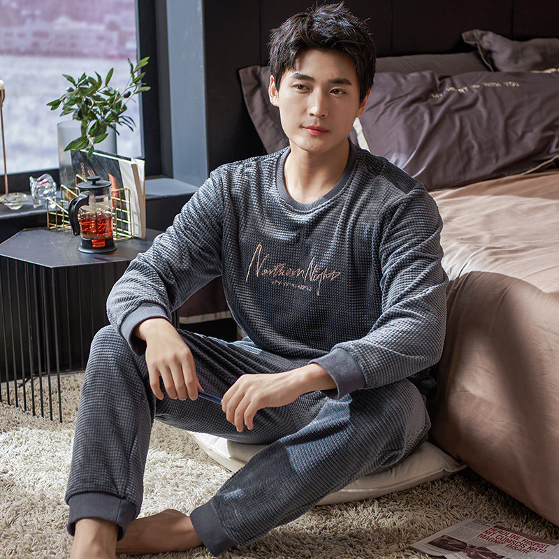 軒の美しいメーカーの直売の家の服の秋冬のフランネルの厚い男性の金の丸首のカバーの頭のレジャーはパジャマの男を着ることができます。