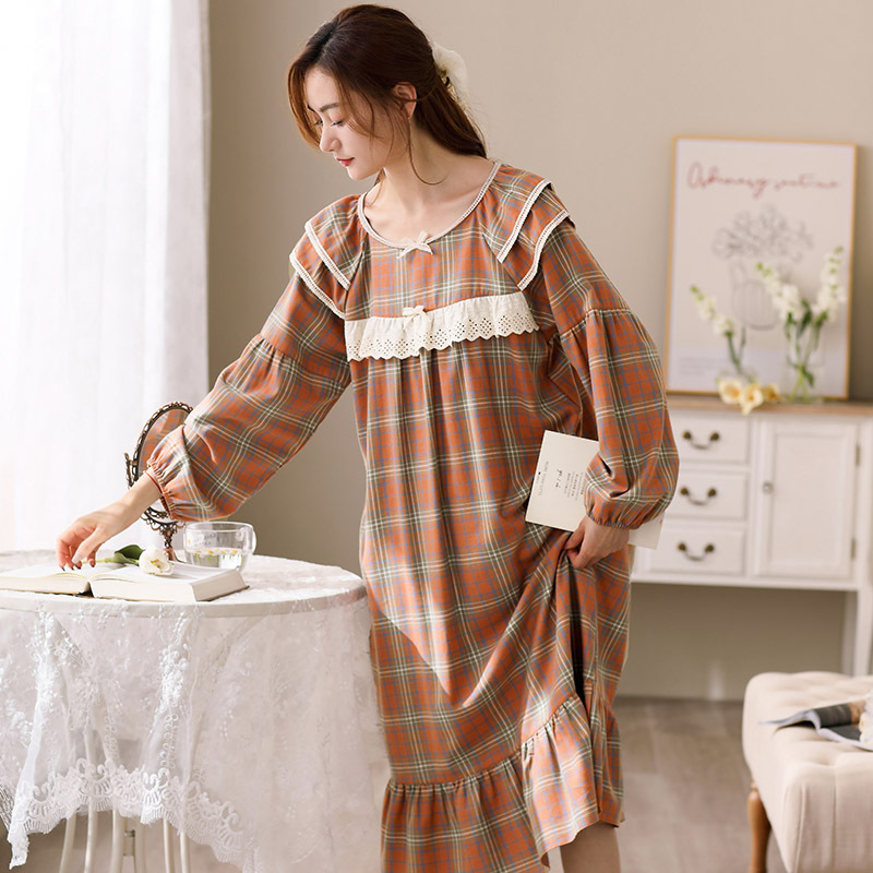軒の美しいメーカーの直接販売の寝スカートの春と秋の布帛の綿の中の長いタイプの格子のパジャマの丸首のカバーの頭は代行することができます。