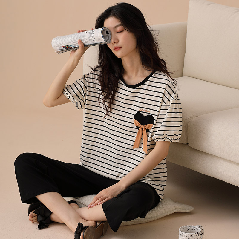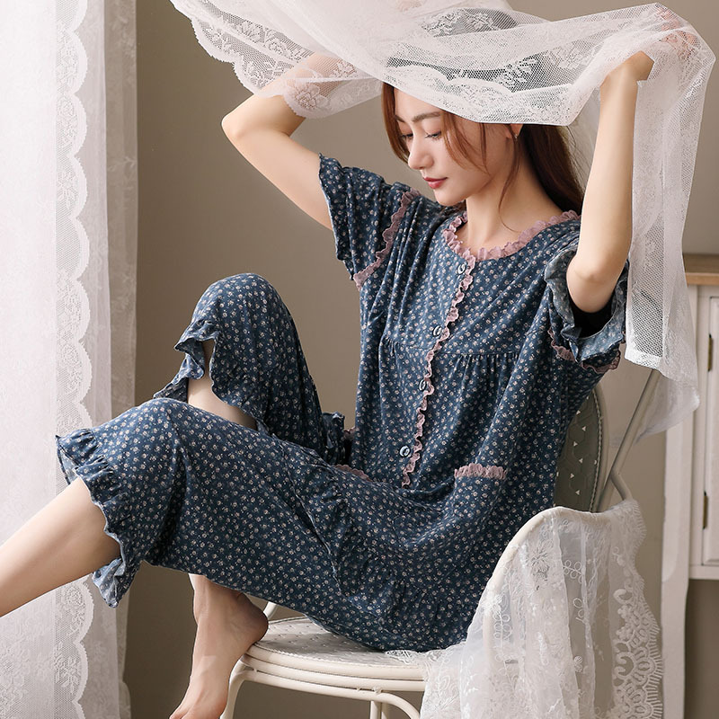 軒の美しいメーカーの直売の家庭服の夏の半袖の7分のズボンの片面の純綿は棚を引っ張ってカジュアルにパジャマの女性を着ることができます。