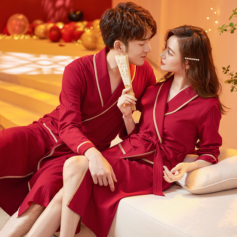 軒の美しいメーカーの直接販売のカップルの家の服の春と秋の結婚祝いの本命年の赤い純綿の棚の男性の女性の寝服