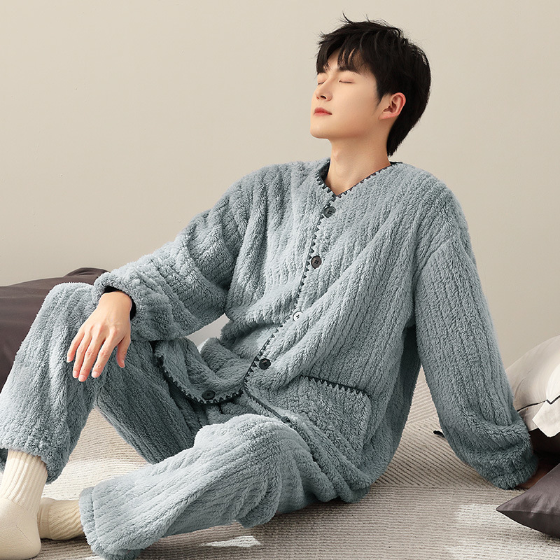 軒の美しい冬の男性の襟をめくるカーディガンの家の服の長袖のズボンのサンゴの絨毛とベルベットの厚い海島の絨毛のパジャマカバー