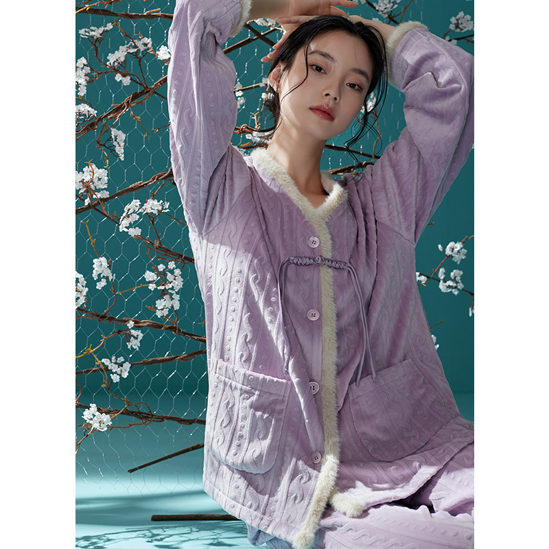 軒の美しい家の服は襟のカーディガンにベルベットをつけて、海島のベルベットを厚くして、長袖のズボンのパジャマセットの女性を着ることができる