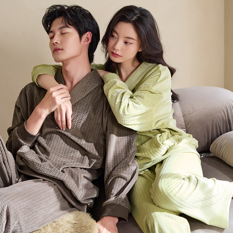 軒の美しい家の服の男性の頭のカップルはベルベットを厚くして、海島のベルベットの長袖のカジュアルでゆったりしているパジャマセットを着ることができます
