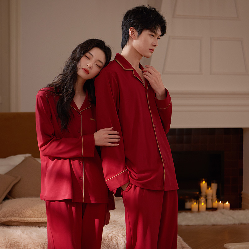 軒の美しいカップルのパジャマの女性の春と秋の長袖の本命年の2つのセットの赤い新婚の結婚する部屋の服の男性