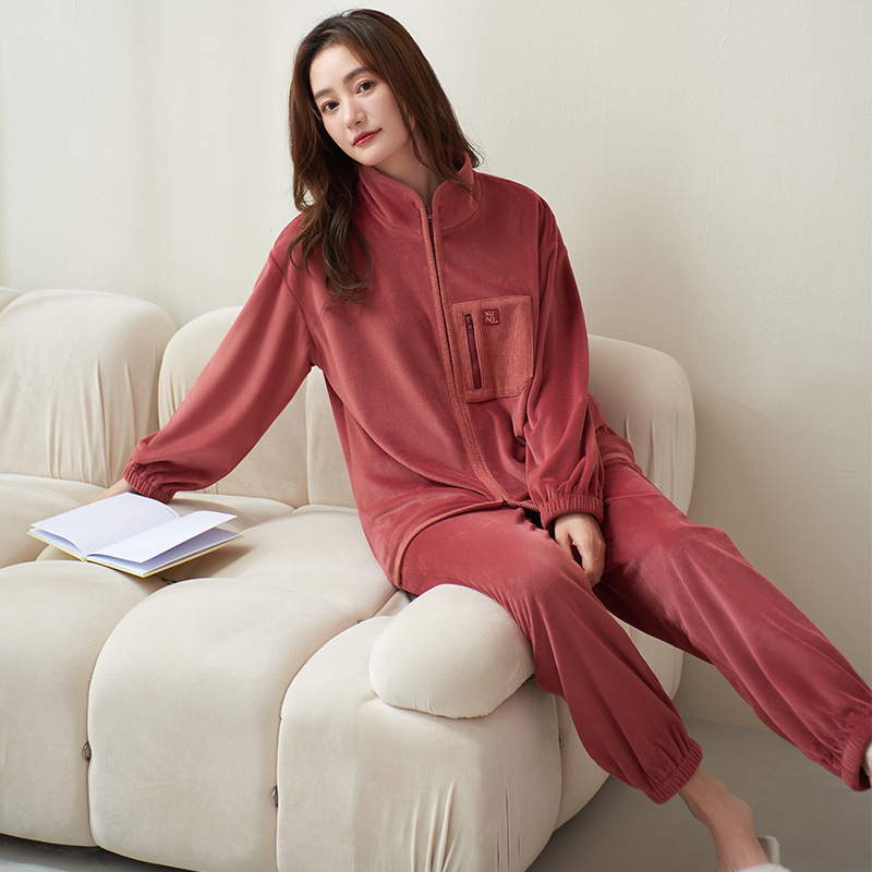 軒の美しい秋冬の女性の家の服の丸首の立襟のファスナーの新型のベルベットは厚くてシンプルな純色の運動のパジャマを厚くします。