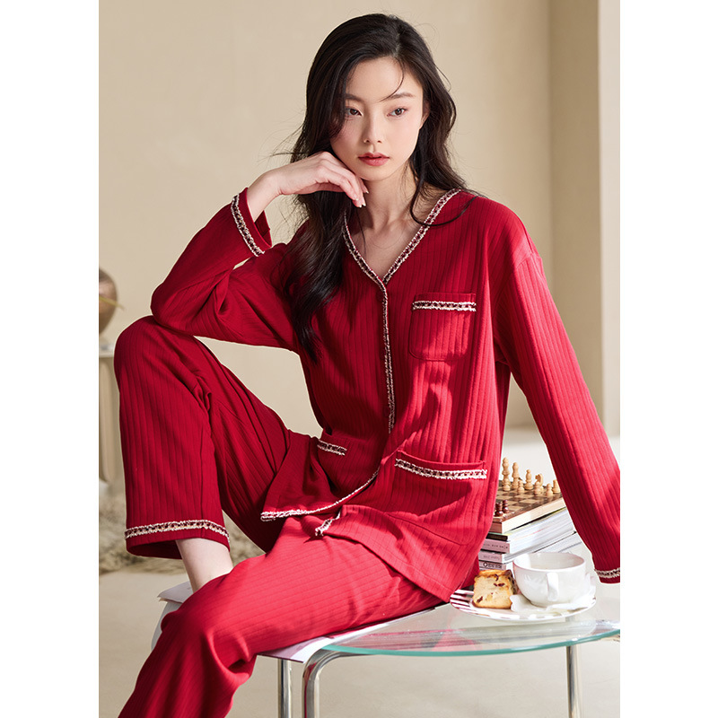 軒の美しい家の服の秋の襟の両面の純綿の長袖の新婚の本命年は外でカップルの家の服のパジャマを着ることができます。