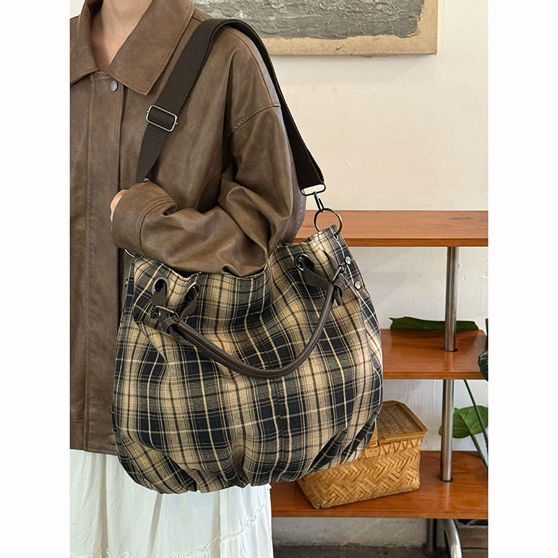 韓国レトロウールチェック柄キャンバスバッグ女性のための 2025 新しい大容量トートバッグ通勤ショルダークロスボディバッグ