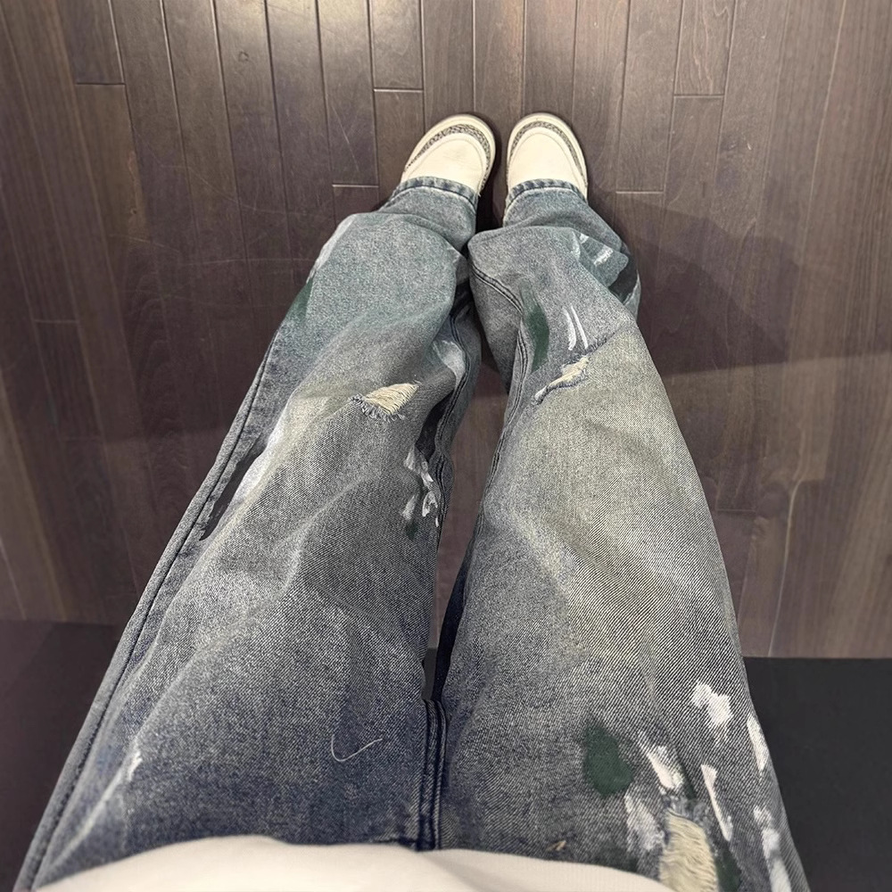 アメリカのレトロな落書きの穴が開いているジーパンの女性2025新型のデザイン感のズボンの高い街のvibeの広い足のズボン