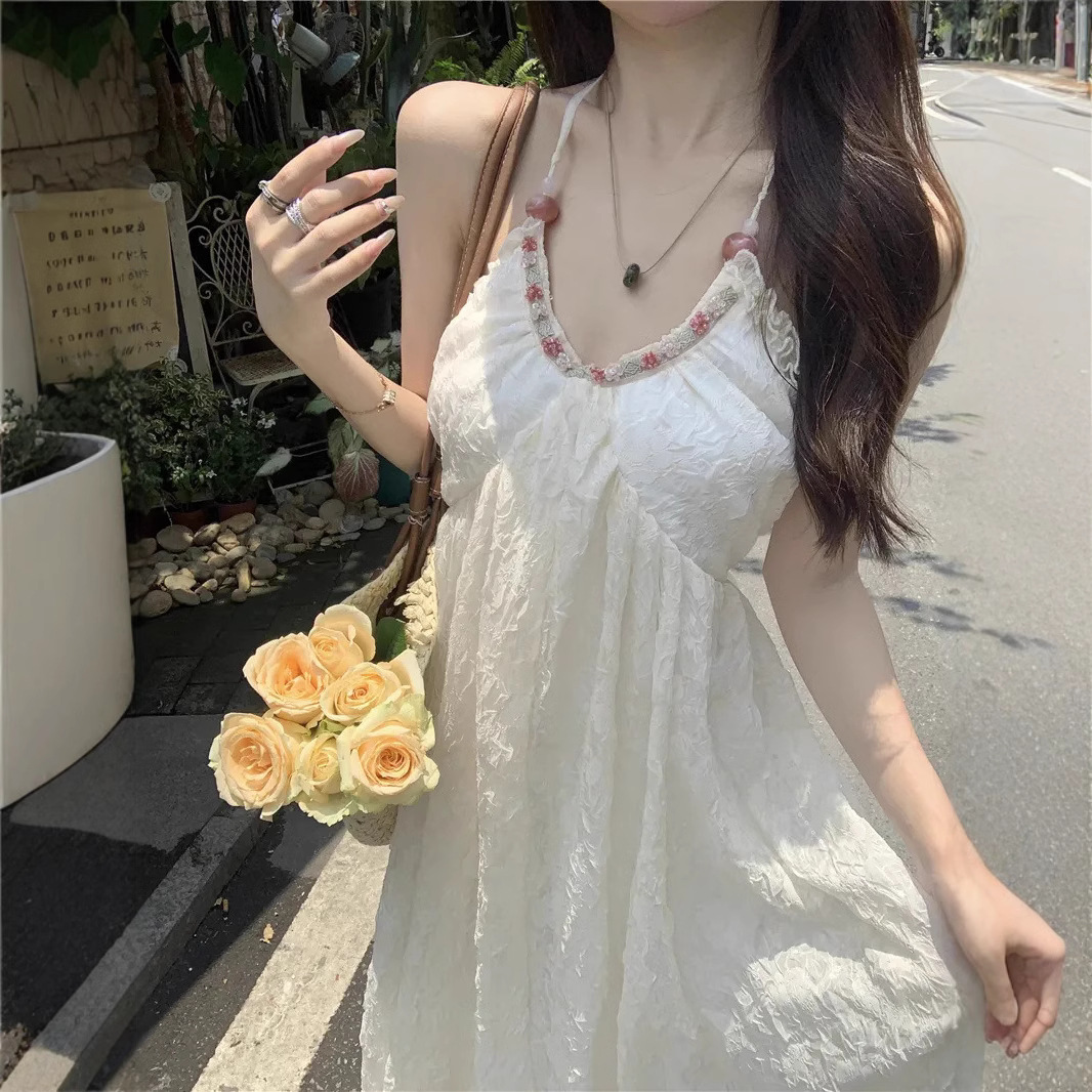フランス式の背中に首をかけるストラップワンピース女性の夏2025新型の甘い気質の海辺のリゾート風のロングスカート