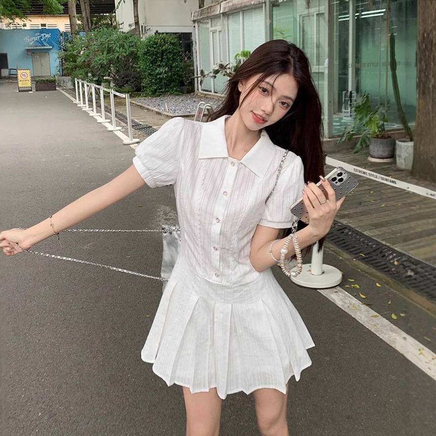 白いシャツのワンピースの女性の小さい子の夏の2025新型は腰を収めて明らかにやせています。