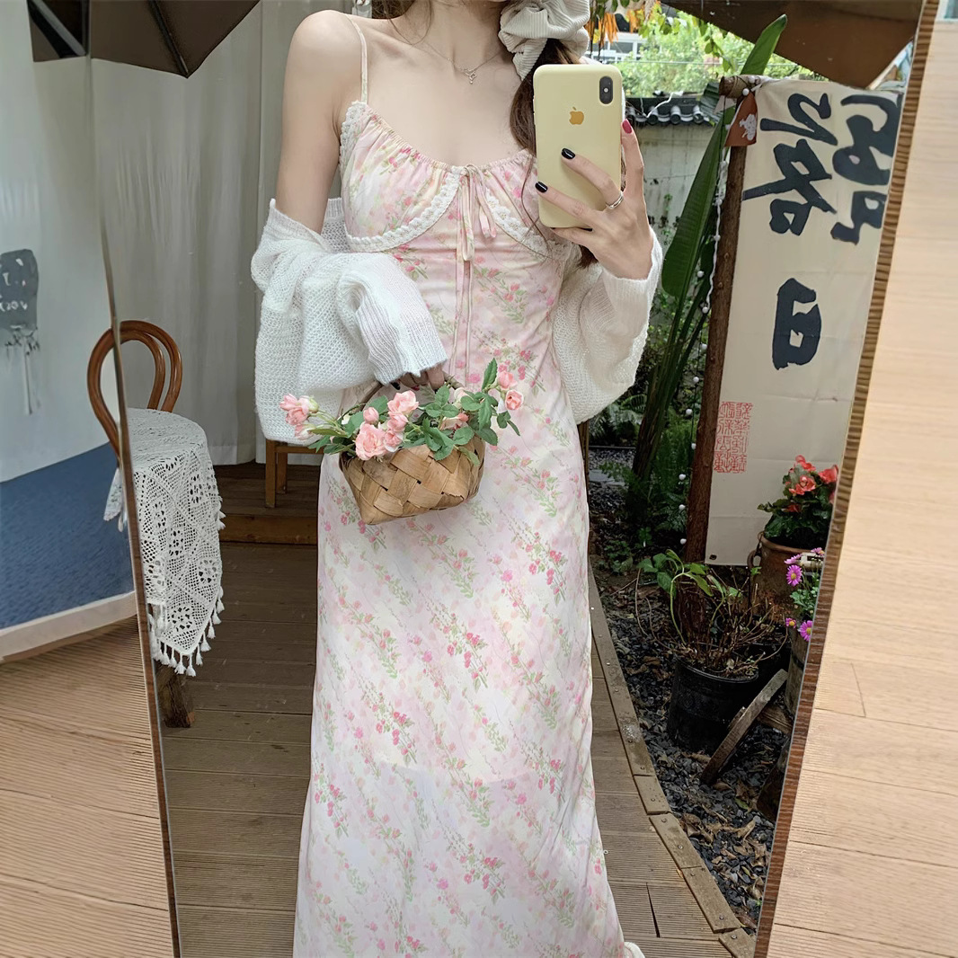 茶休フレンチの花のストラップの中の長いワンピースの女性の夏の新型のレースのつなぎ合わせは明らかにやせて腰のスカートの女性を収めます。