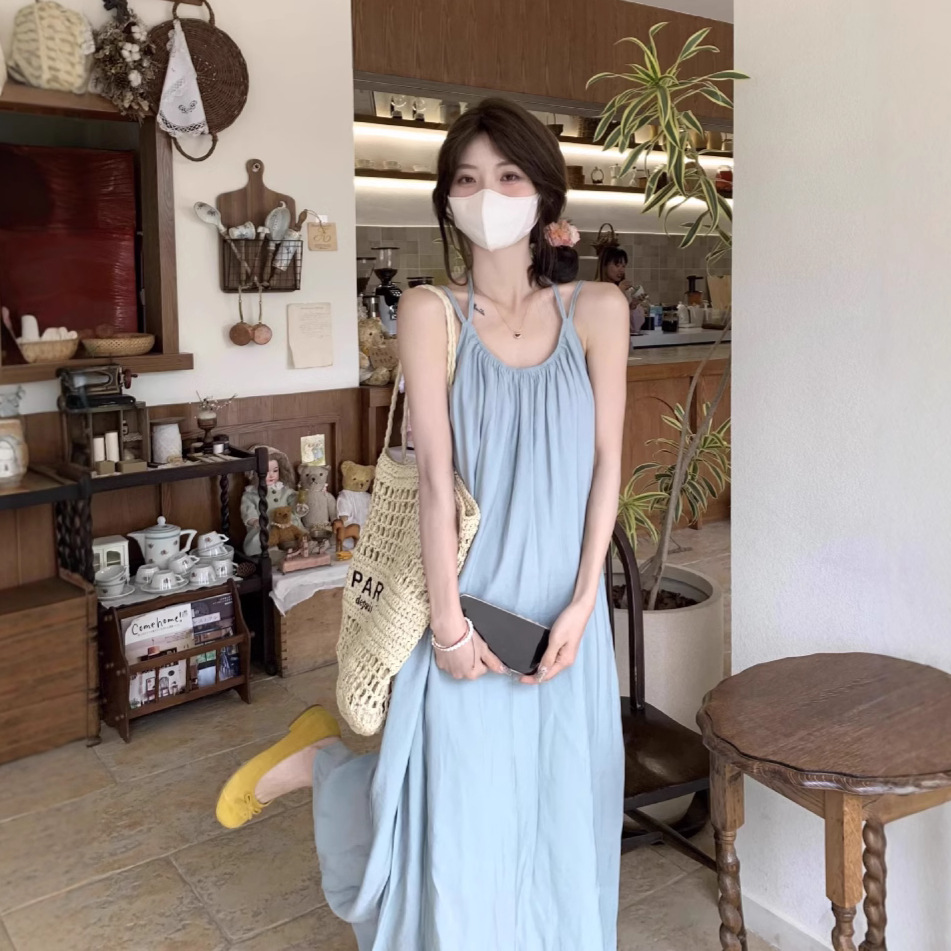 青いストラップ海辺リゾート風ワンピース女性夏2025新型ゆるい背中ストラップA字ロングスカートins