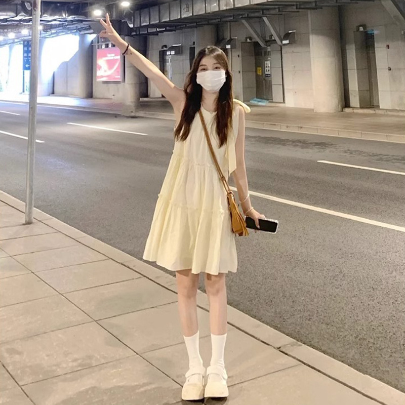 バレエ風の方襟の紐を引いてつぼみのワンピースの夏の新型の甘い系の少女感は腰のベストのスカートの女性を収めます。