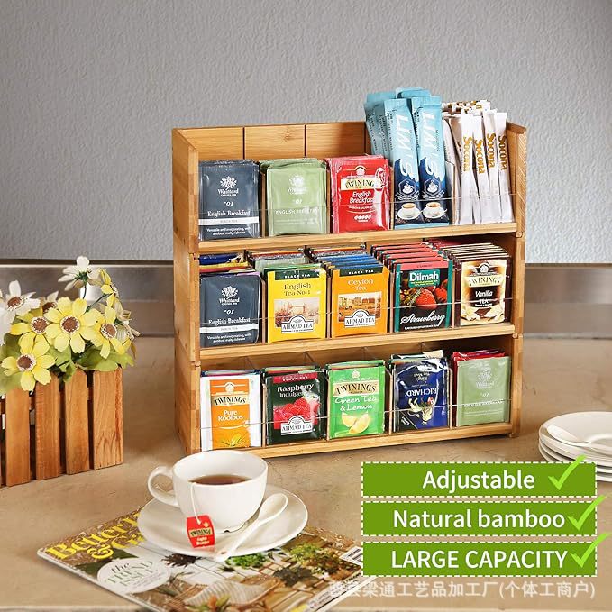 竹ティーバッグ収納ボックス積み重ね可能なデスクトップディスプレイラックコンパートメント収納ラックティールームティーラックティーバッグホルダー