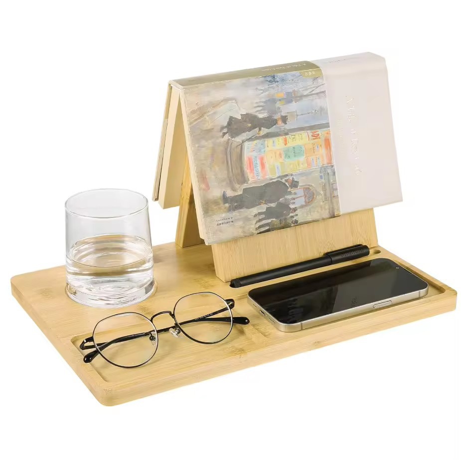 木製三角形ブックマークホルダーカップ付きホームブックホルダーメガネ木製トレイテーブル装飾読書スタンド