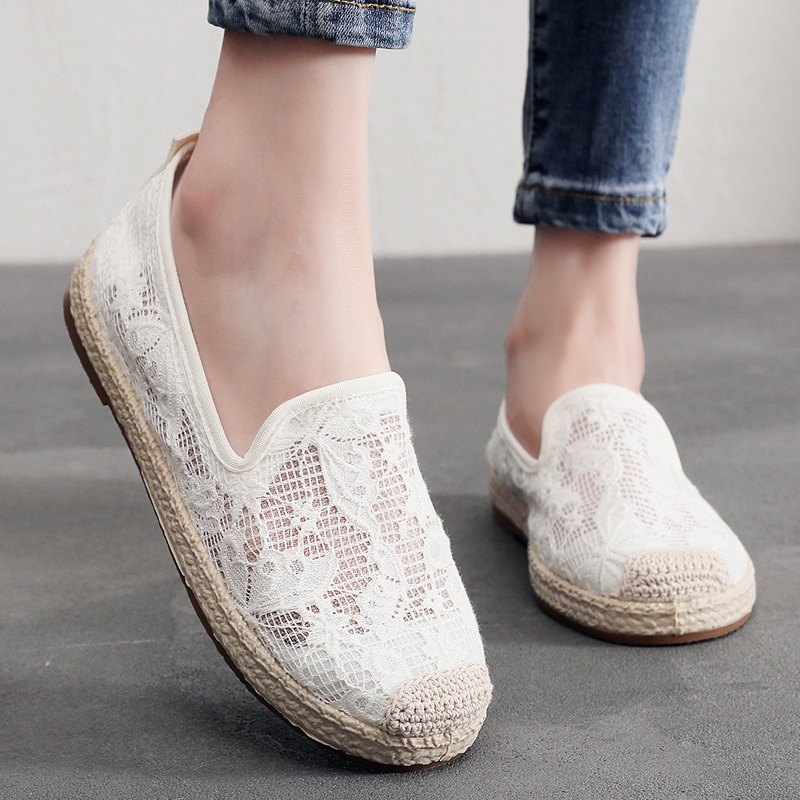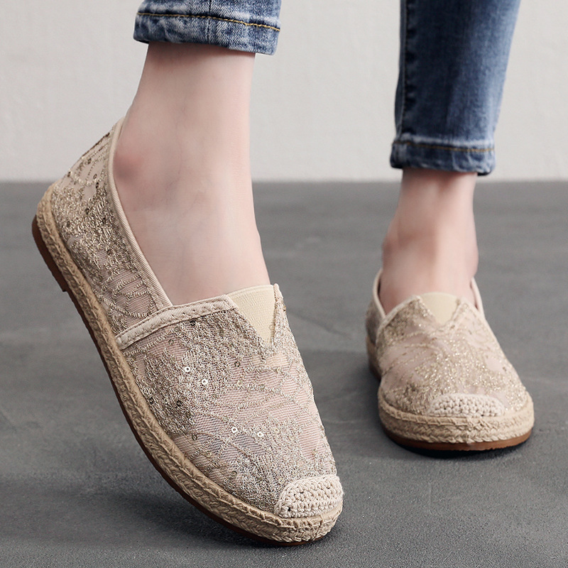 漁師の靴 2025 夏の新レースカジュアルフラット女性のメッシュシューズ古い北京布靴女性の怠惰なスリッポン